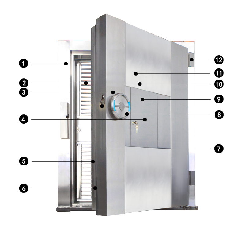 四鎖聯動裝置:主門上配備3把美國進口機 械密碼鎖和1套指紋鎖,帶四鎖聯動裝置(鎖具配置可根據客戶要求進行調整); 文物庫房門在2人以上同時開啟四套鎖具中 任意三套鎖具后,方能開啟。